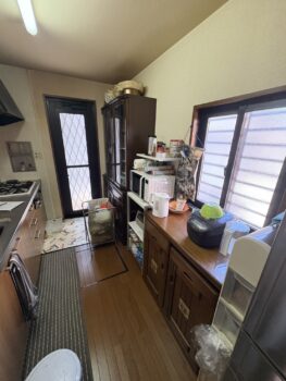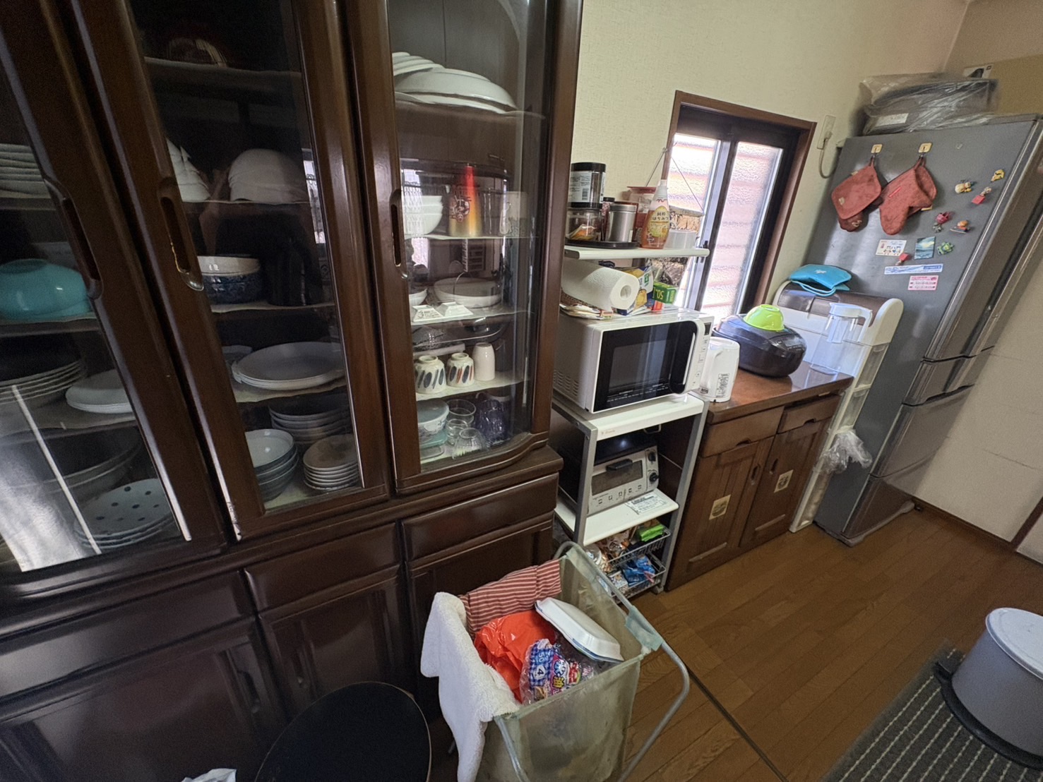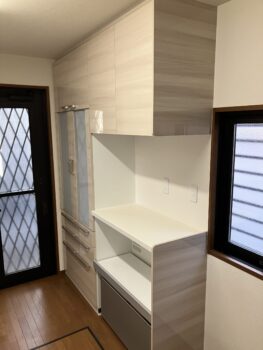キッチンと同じ柄のカップボートも設置したので、収納のアップし、見た目もスッキリしました。