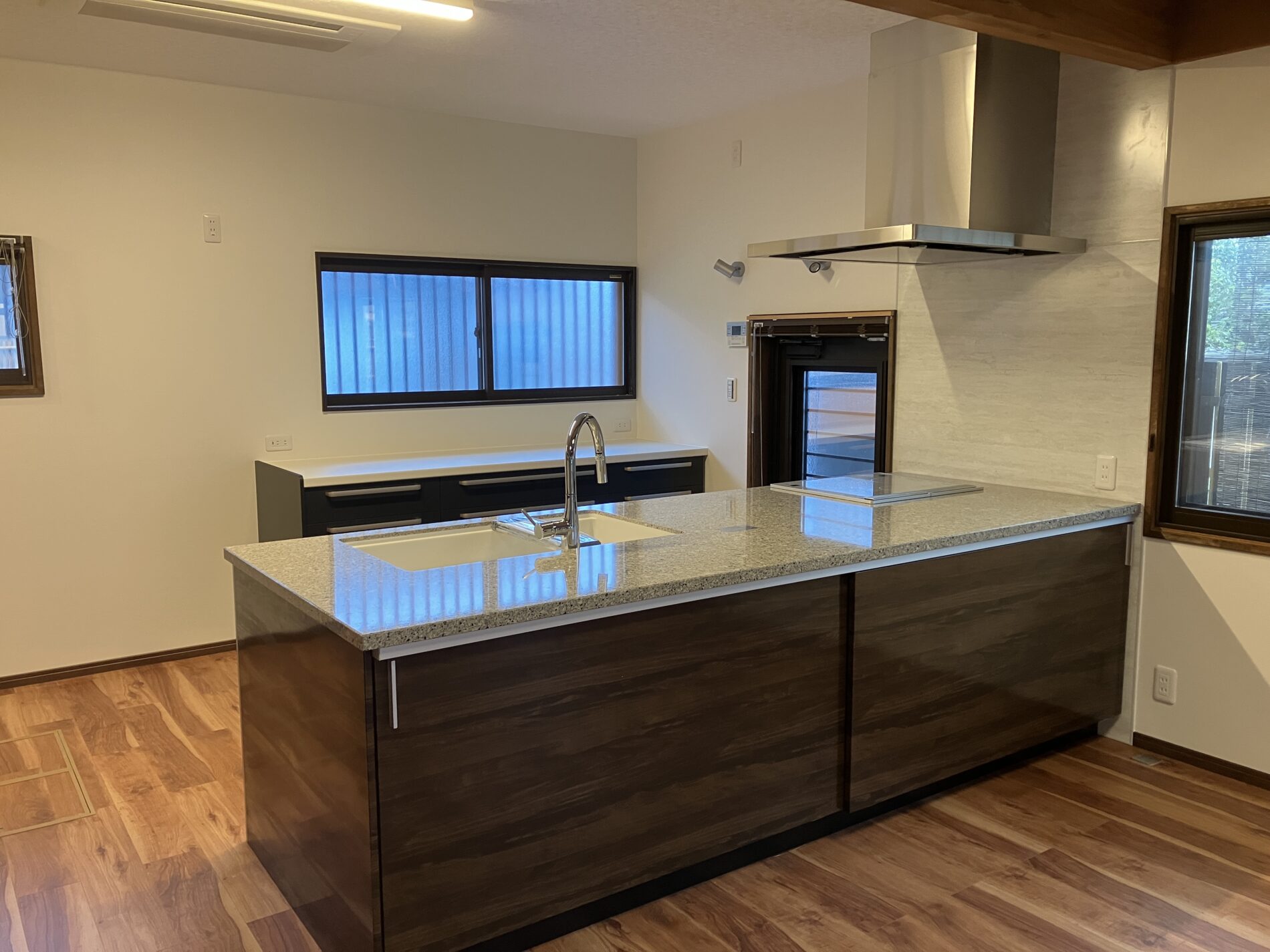 床材の色とキッチンの扉・天板の色が重厚感があり、落ち着いた雰囲気になりました!!