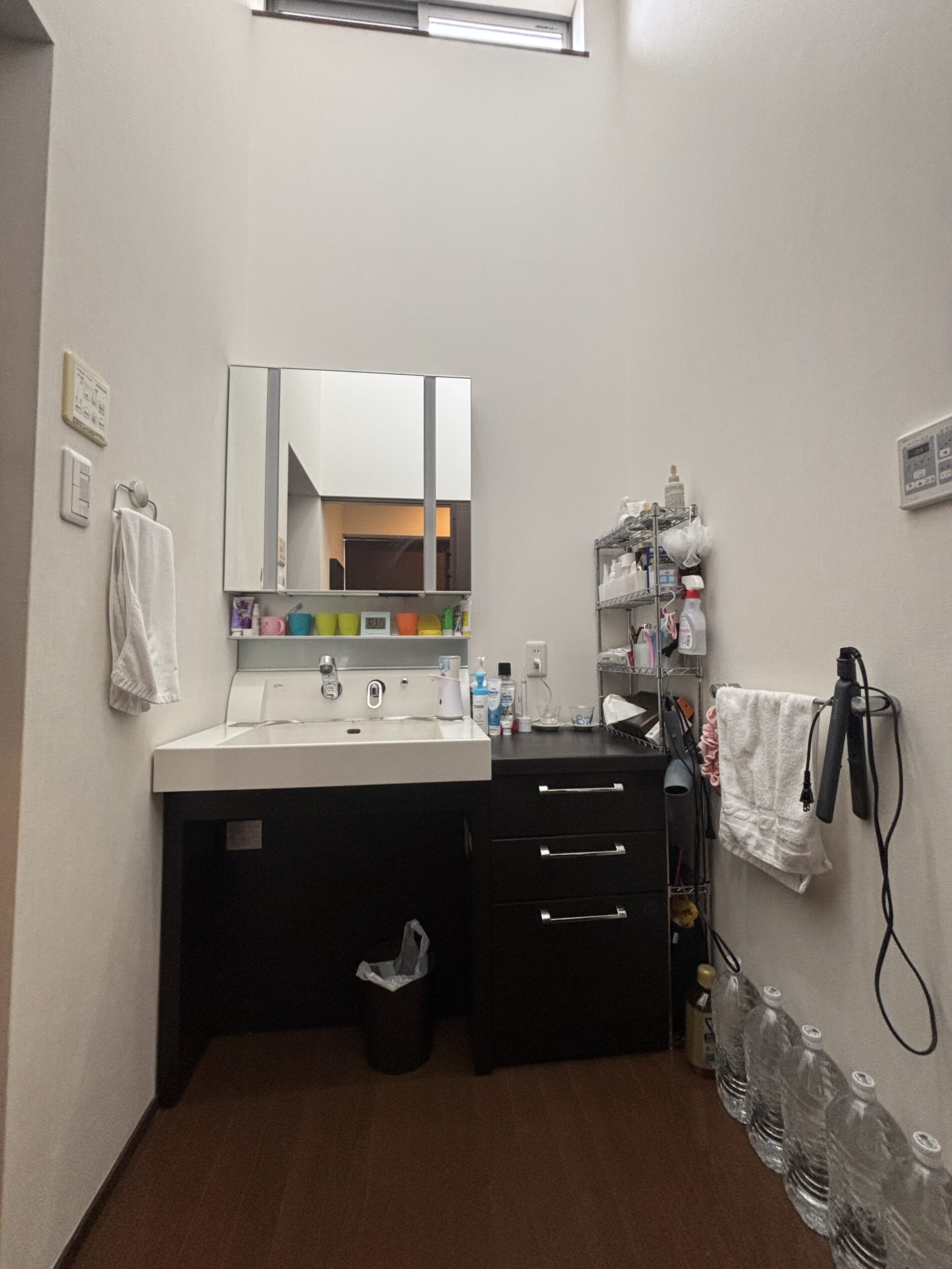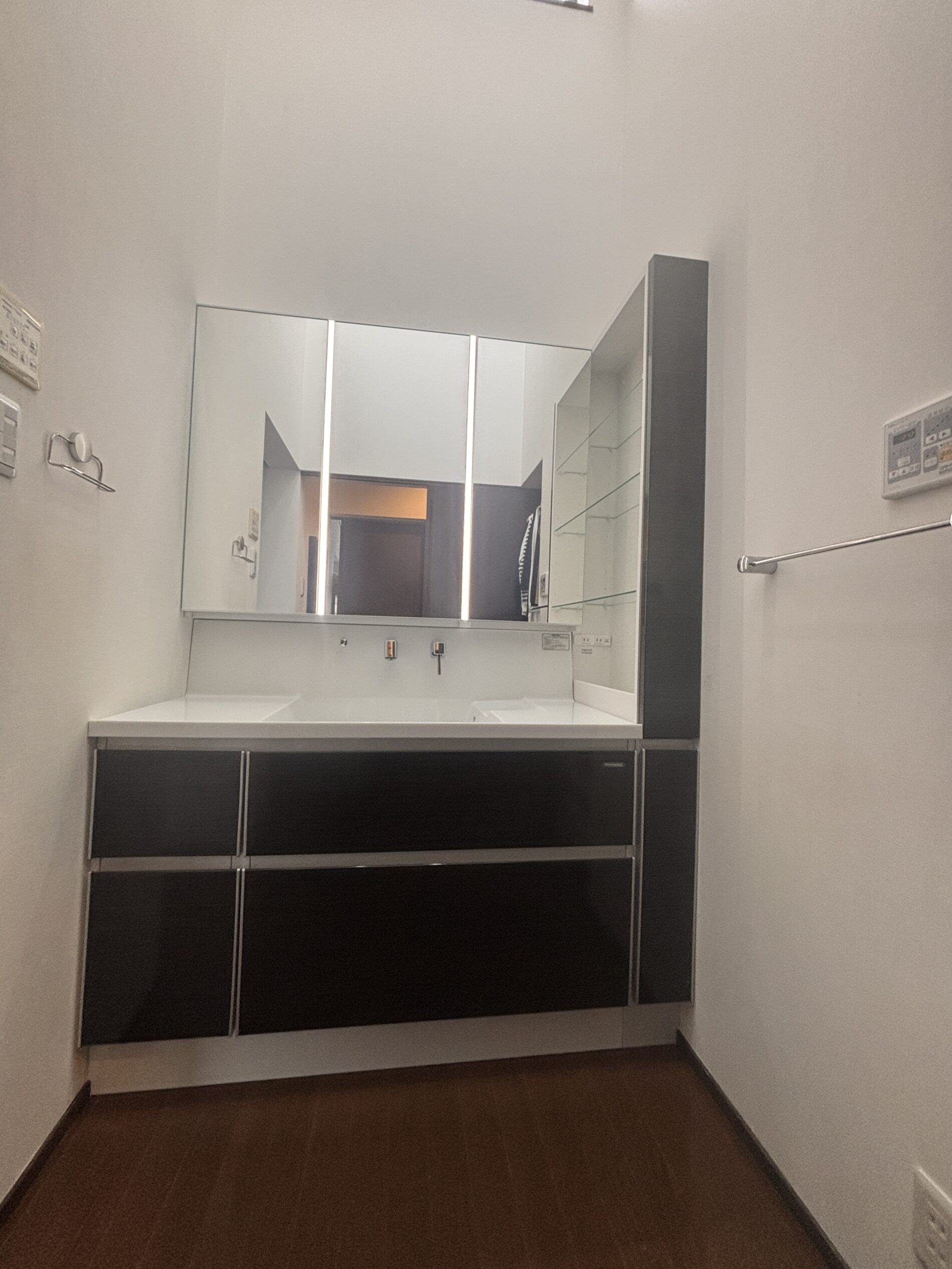 間口120cmの洗面台に間口15cmのトールキャビネットを取付。