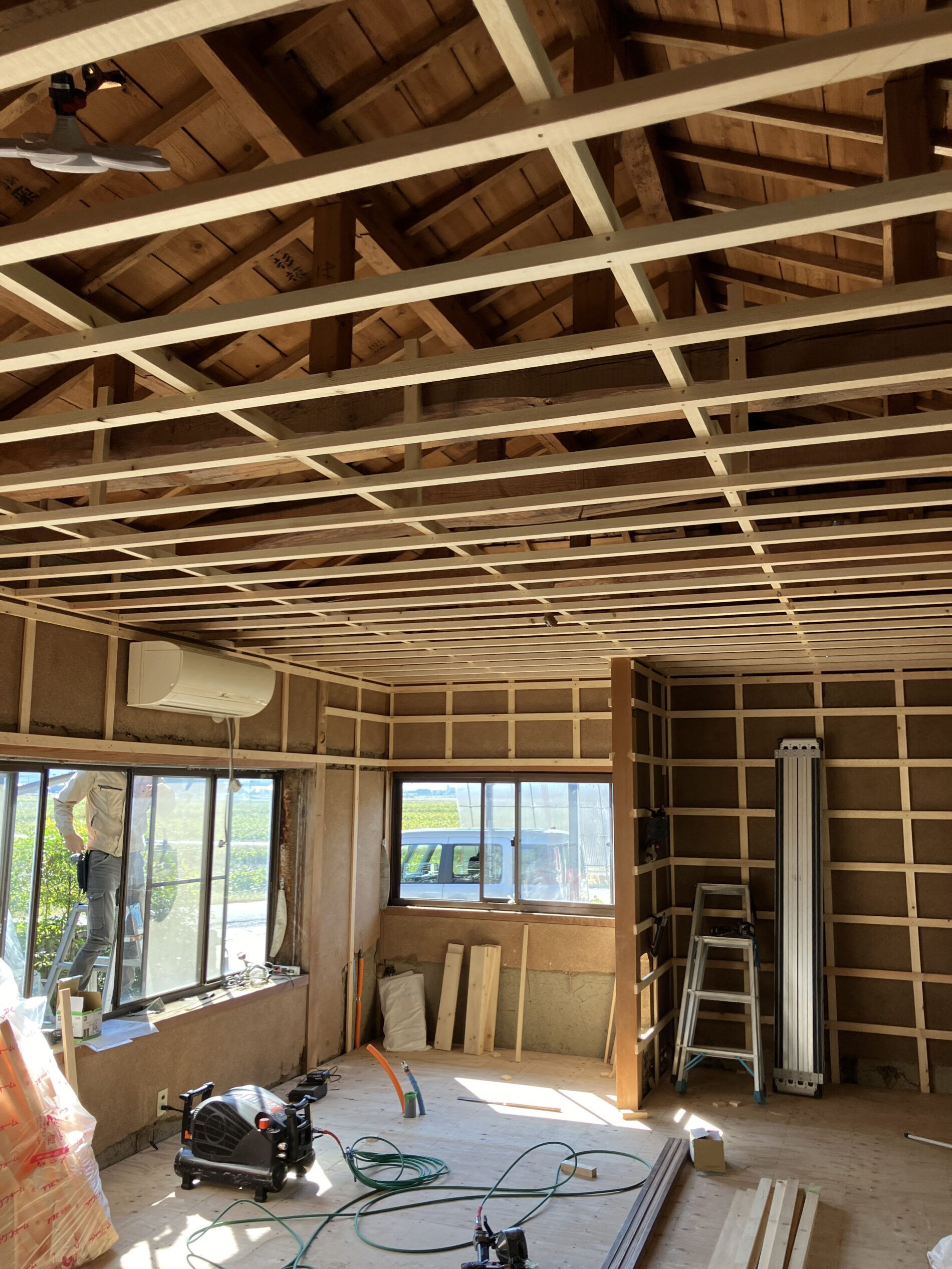床は土足で上がってもらえるシート張りにするのでベニヤ板でしあげていて天井を組んでいき、