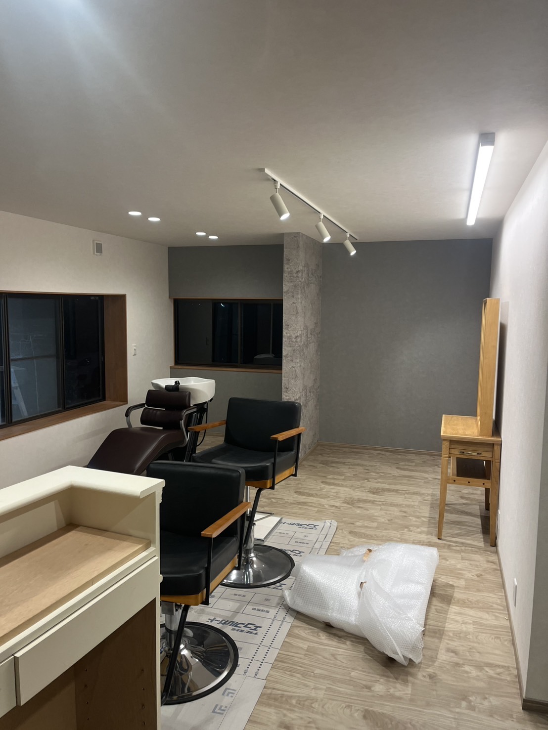 シャンプー台を設置して、椅子やドレッサーはお客様が選んだものを運び入れてもらいました