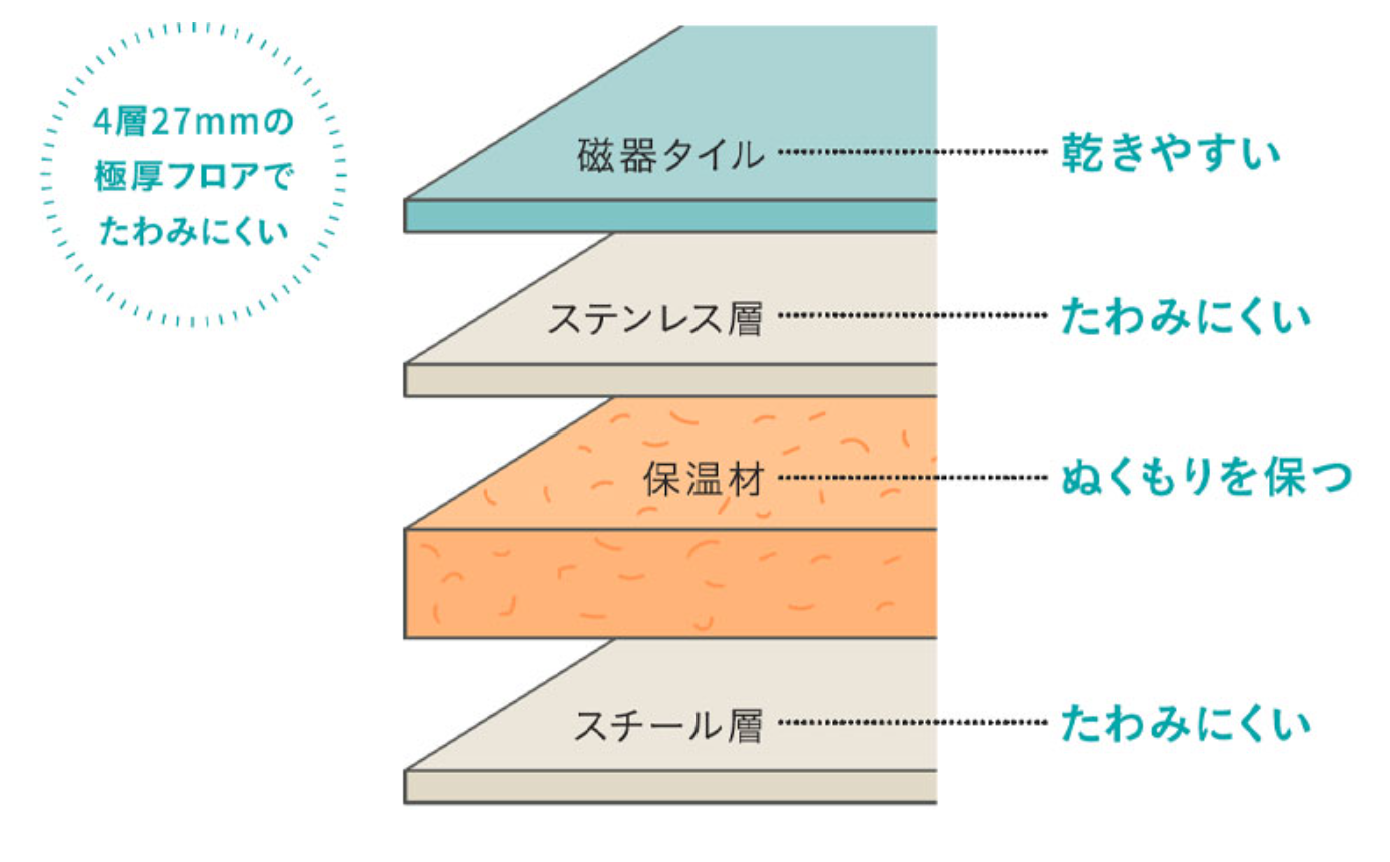 床鳴りの原因となる床の「たわみ」を防ぐ、4層構造を採用。