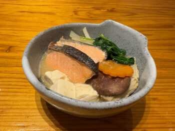ぶつ切りした鮭の身とあらを野菜と一緒に昆布のだし汁の中に入れて味噌で味をととのえて