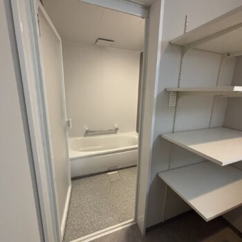 洗濯機横のスペースがあいているので、浴室の出入口に近い壁面に可動棚を設置!