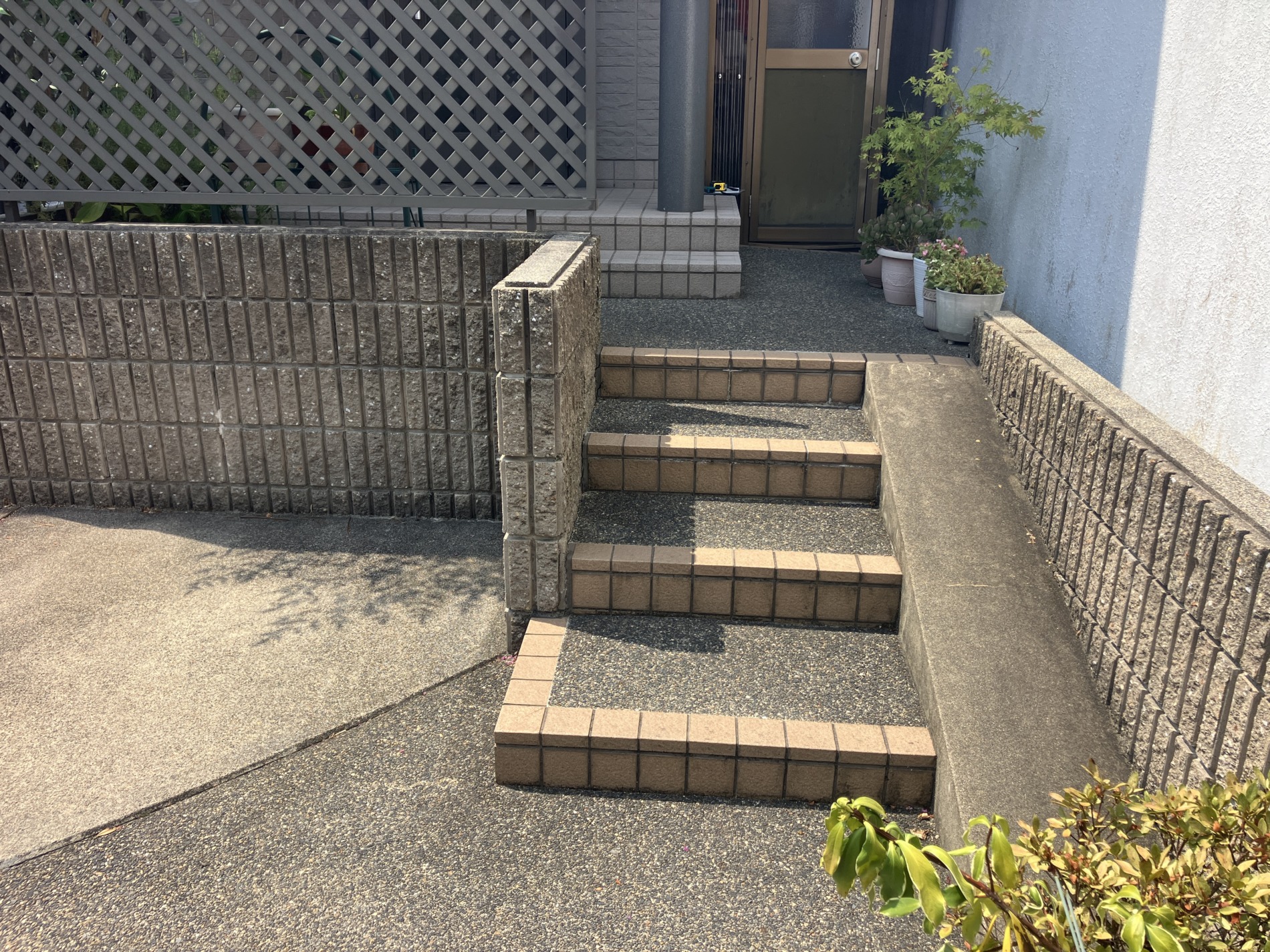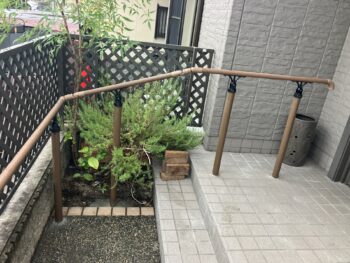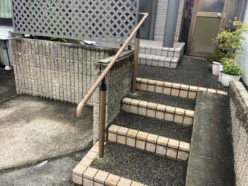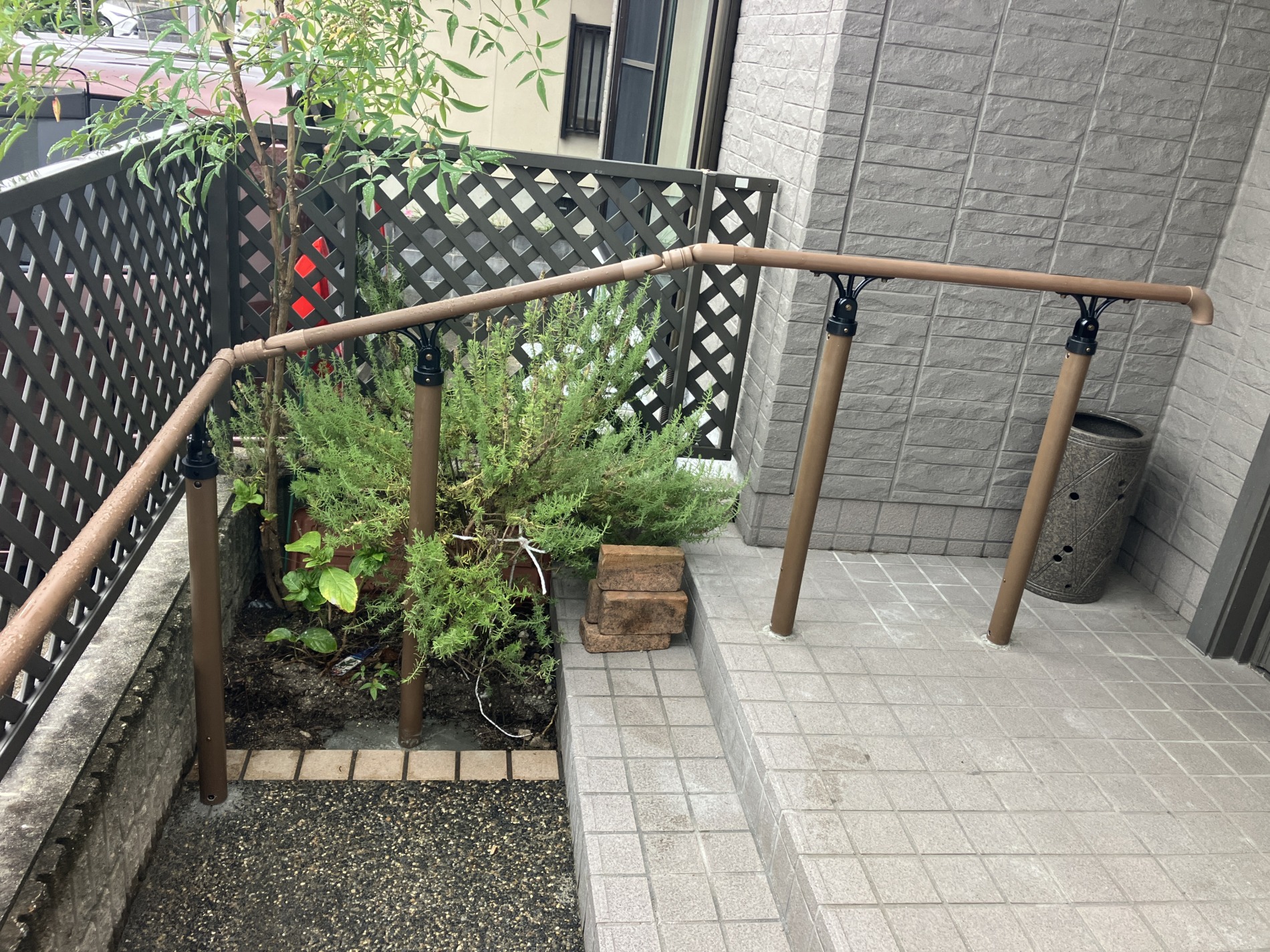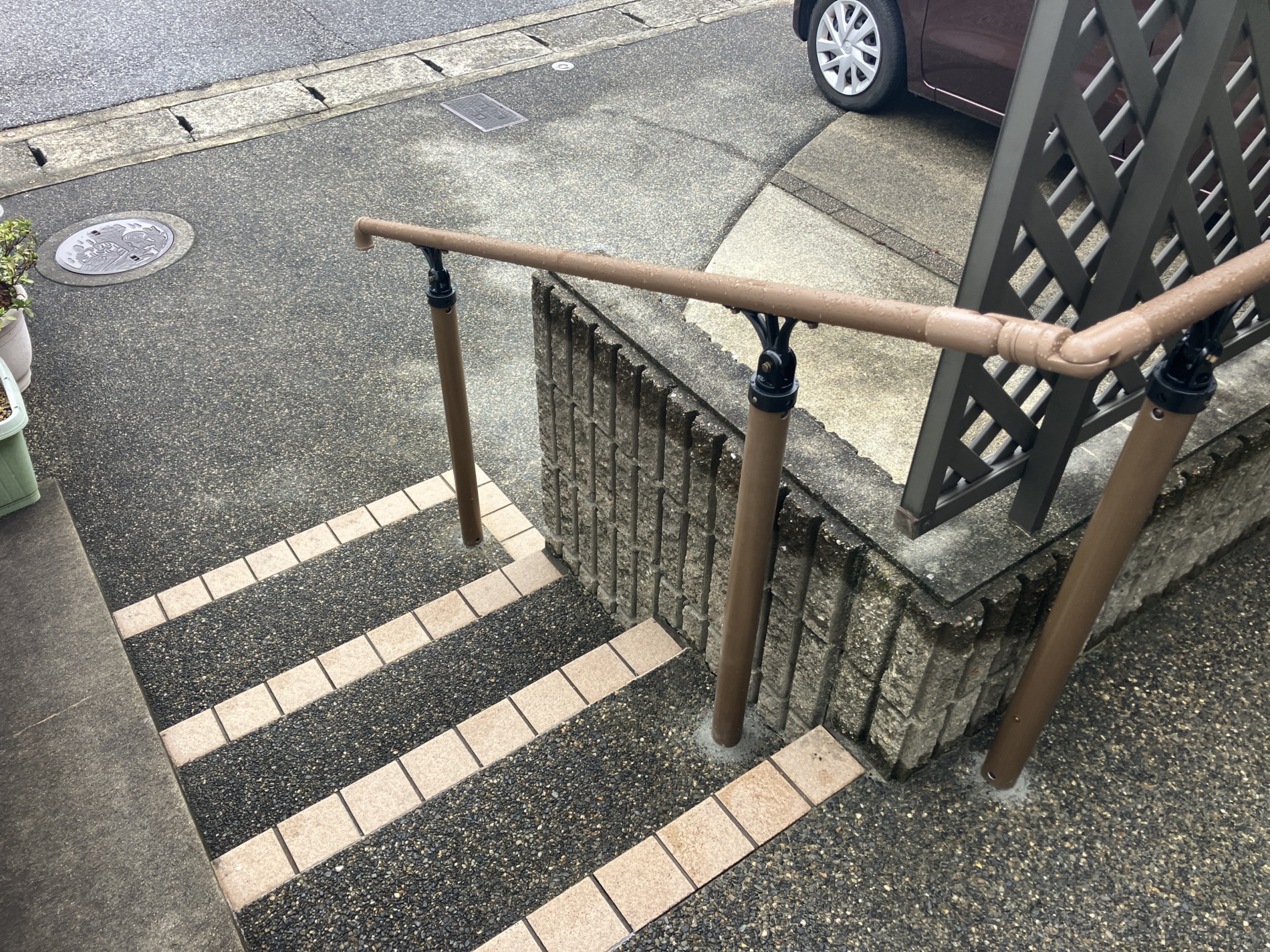 お客様の奥様が足を悪くされ、安心して外出できるよう、支えとなる外部手すりの