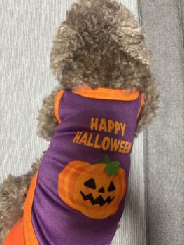 ダイソーにハロウィン服が売ってたので毛もふもふな犬に着せました。