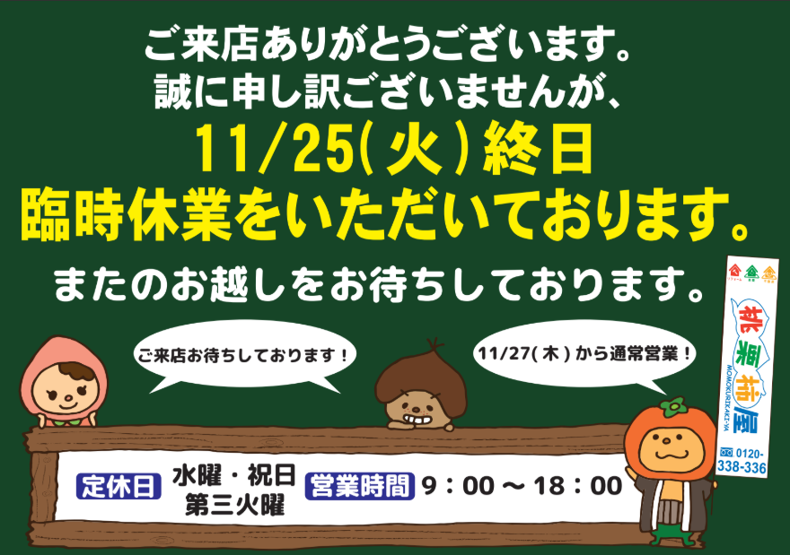 本日11月25日は、臨時休業をいただいております