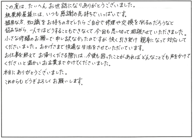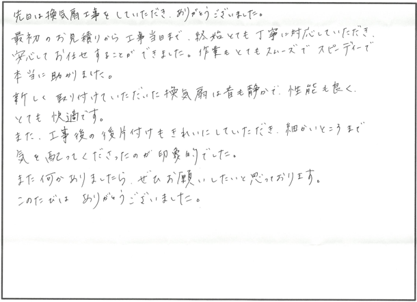 先日は換気扇工事をしていただき、ありがとうございました。 最初のお見積りから工事当日まで、終始とても丁寧に対応していただき、安心してお任せすることができ…