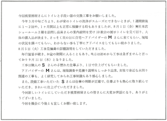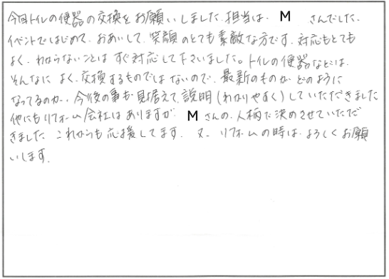 今回トイレの便器の交換をお願いしました。担当はMさんでした。 イベントではじめておあいして、笑顔のとても素敵な方です。対応もとてもよく、わからないことは…
