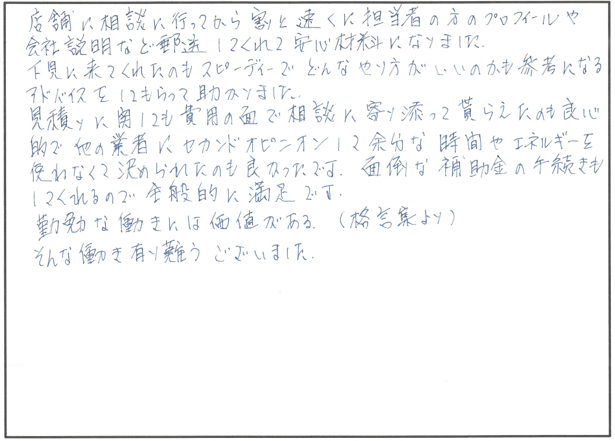 店舗に相談に行ってから割と早くに担当者の方のプロフィールや会社説明など郵送してくれて安心材料になりました。 下見に来てくれたのもスピーディーで、どんなや…