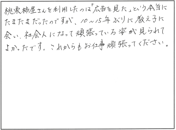 桃栗柿屋さんを利用したのは「広告を見た」という本当にたまたまだったのですが、10〜15年ぶりに教え子に会い、社会人になって頑張っている姿が見られてよかった…