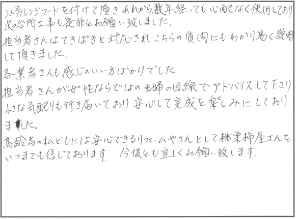 以前レンジフードを付けて頂き、あれから数年経っても心配なく使用しており、次の台所工事も是非とお願い致しました。 担当者さんはてきぱきと対応され、こちらの…