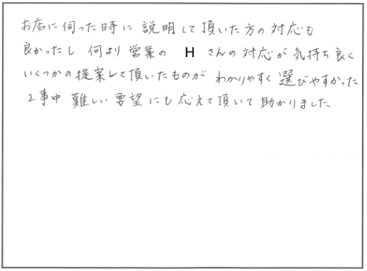 お店に伺った時に説明して頂いた方の対応も良かったし、何より営業のHさんの対応が気持ち良く、いくつかの提案して頂いたものがわかりやすく選びやすかった。 工…