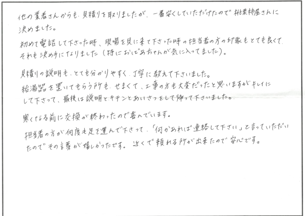他の業者さんからも見積りを取りましたが、一番安くしていただけたので桃栗柿屋さんに決めました。 初めて電話して下さった時、現場を見に来て下さった時の担当者…