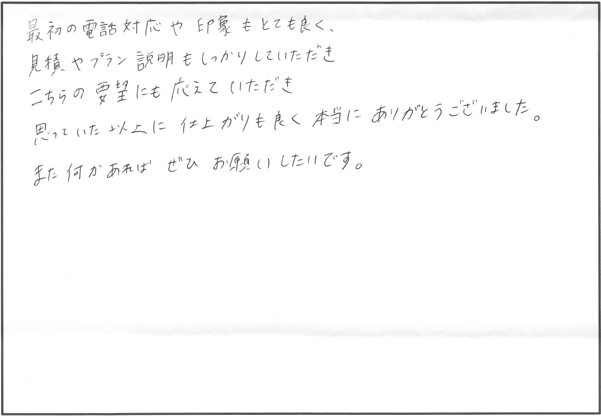 最初の電話対応や印象もとても良く、見積やプラン説明もしっかりしていただき こちらの要望にも応えていただき思っていた以上に仕上がりも良く本当にありがとうご…