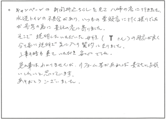キャンペーンの新聞折込ちらしを見て、八日市の店に行きました。 水洗トイレの不具合があり、いつもの量販店に行くつもりでしたが、参考の為に貴社の店に寄りまし…