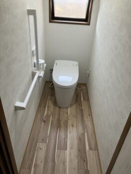 <担当者からのコメント> 最初にお話を伺った際、タイルの床の冷たさや、掃除のしにくさを気にされていました。そこで、見た目も美しく、お手入れも簡単な木目柄のクッションフロアをご提案いたしました。冬でも温かく、居心地の良い空間になったかと思います。また、便器はリクシルの『サティスS』を設置しました。タンクレスのコンパクトなデザインは、限られた空間を広く見せ、節水にも優れています。そして、便器の奥まで手が届き、拭き掃除ができる『お掃除リフトアップ』機能は、お客様の『掃除を楽にしたい』というご希望を叶える最適な選択でした。新しくなったトイレをご覧になり「桃栗柿屋さんに頼んで本当によかった」と喜んで頂きました。