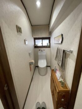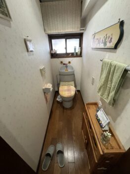 <担当者からのコメント> この度はトイレのリフォームをお任せいただき、ありがとうございました。急な水漏れのトラブルを解決し、毎日を気持ちよく過ごしていただけるよう、使い勝手の良さに定評のあるTOTOの一体型トイレ『GG1-800』をご提案いたしました。あわせてクッションフロアも明るい色調のものへ張り替えたことで、空間全体がパッと明るく、清潔感あふれる印象に生まれ変わっています。GG1-800は、背の高い方でも使いやすい高さの手洗いボウルを備えており、水はねもしにくく快適にお使いいただけます。素早い対応で「桃栗柿屋さんに頼んで本当によかった」と喜んで頂きました。