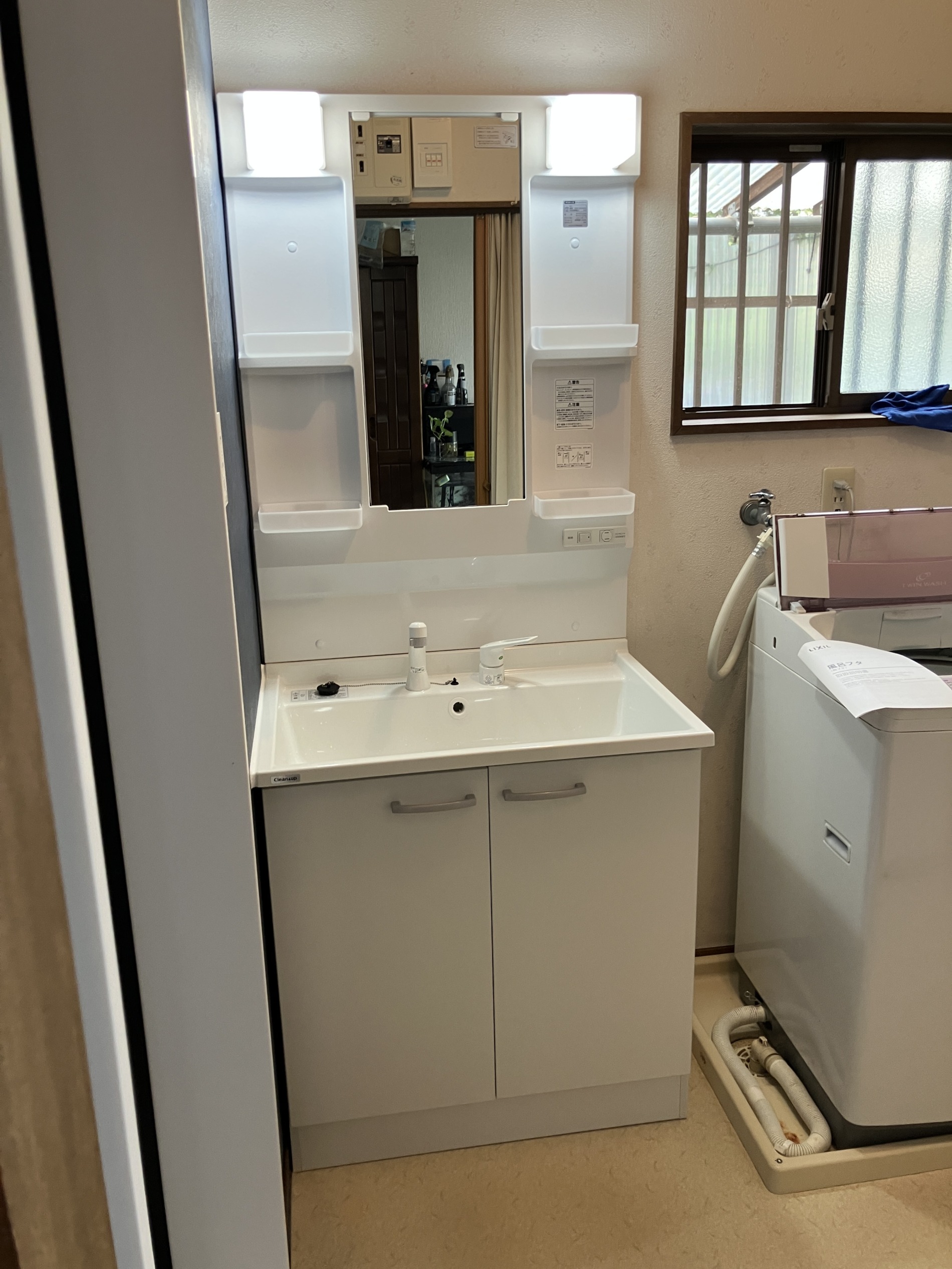 <担当者からのコメント> タイル張りの浴室の寒さ、お手入れの大変さという長年の悩みを解決するため、LIXILのユニットバス『リデア』をご提案いたしました。リデアの『サーモフロア』は乾きやすくお手入れも簡単で、浴槽は『高断熱浴槽』で温かさが長持ちします。洗面台はクリナップの『BGA』を設置。広く使いやすい洗面ボウルと、便利なシングルレバーシャワー水栓で、朝の身支度がスムーズになります。また、脱衣室全体の内装も一新したことで、明るく清潔感のある、快適な空間に生まれ変わりました。新しくなった浴室をご覧になり、「桃栗柿屋さんに頼んで本当によかった」と喜んで頂きました。