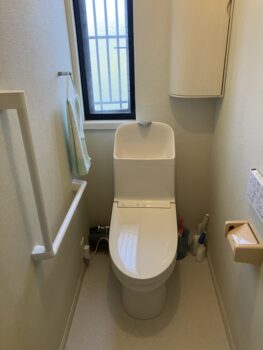 <担当者からのコメント> この度はトイレのリフォームをお任せいただき、ありがとうございました。お客様の「清掃性」と「安全性」のご要望にお応えするため、棚を撤去し、TOTOの『ZR1』をご提案いたしました。コンパクトなZR1は、以前のレストパルよりも空間を広々と使えるようになり、お掃除も簡単です。機能面では、『深ひろボウル』は、手を洗いやすいゆとりのある設計で快適にお使いいただけます。また、壁には手すりを新設し、立ち座りが楽で安心できる、バリアフリーに配慮した空間に生まれ変わりました。新しいトイレが、より快適で安全になり「桃栗柿屋さんに頼んで本当によかった」と喜んで頂きました。