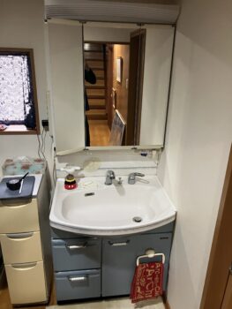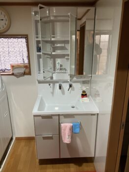 ~東近江市 洗面台交換をされたお客様のきっかけ~ 長年使用してきた洗面台の経年劣化による汚れや、水まわりの傷みが気になっていました。毎日家族全員が使う場所なので、掃除がしやすく、この先も長く綺麗に使い続けられる丈夫なものに交換したいと考え、リフォームを依頼しました。